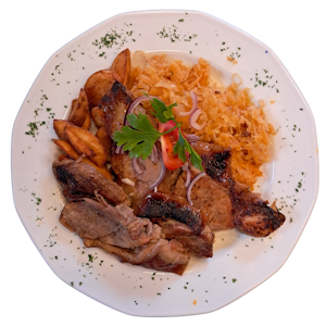 Rántott borda, roston szűz kakastaréjjal, kárpáti borzaska, rántott sajt, vegyes köret